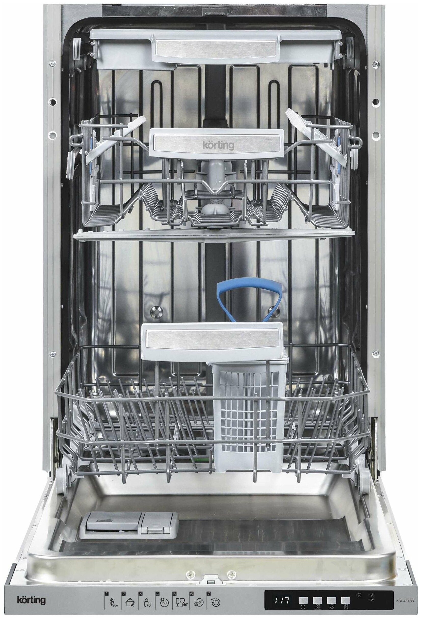 Встраиваемая посудомоечная машина Korting KDI 45488 оснащена полной защитой от протечек, что гарантирует безопасную эксплуатацию. Специальный индикатор «луч на полу» проецирует время до окончания программы. Автопрограмма определяет степень загрязнения посуды и подбирает нужную температуру для мытья. Мобильный лоток для столовых приборов помещается в нижнюю корзину.