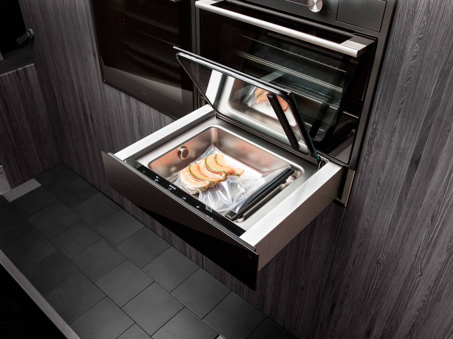 Вакууматор Asko ODV8127B станет незаменимым помощником на Вашей кухне. Устройство работает со стандартными пакетами 25×35 см, что делает эксплуатацию удобнее. Товар выполнен в цвете черная сталь, что подойдет к любой кухне и дополнит его интерьер. Управление осуществляется за счет сенсорной панели, которая находится за фронтальной частью. Благодаря этому она защищена от пыли и других воздействий. Интуитивно понятные кнопки делают навигацию простой и удобной. Выдвигается устройство на телескопических направляющих с фиксацией. Это помогает легко открывать и закрывать девайс. Открывается данная техника по принципу touch2Open. То есть необходимо нажать на фронтальную часть, тогда механизм сработает. Отсутствие ручек гарантируют безопасность данного процесса.