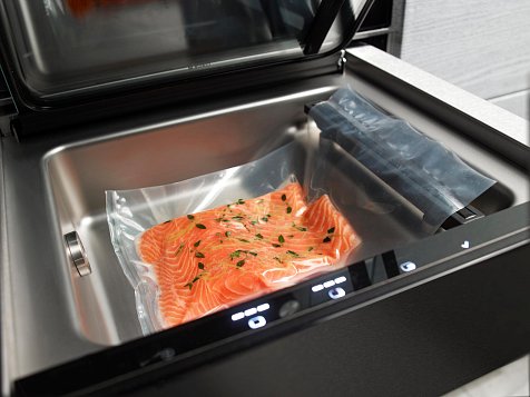 Вакууматор Аско ODV8127B можно запрограммировать на три уровня вакуума. Низкий используется для нежных продуктов вроде фруктов, ягод и хлеба. Средний — для жидкостей и мягкой пищи вроде супов и рыбы. А на высоком хранят твёрдые продукты вроде мяса, сыров, овощей и многое другое. Есть ещё нулевой уровень. Он используется для кратковременного хранения, например, для запечатывания пакета с печеньем. Уровень запайки (их тоже три) зависит от толщины пакета. Также важно заметить удобство встраивания оборудования: его высота составляет — 14,1 см, ширина — 59,7 см, глубина — 55 см.